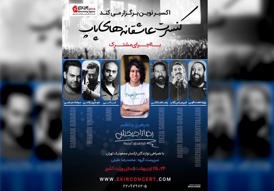 به گزارش موسیقی آرمانی : کنسرت عاشقانههای پاپ با اجرای مشترک شش خواننده، به رهبری و تنظیم رضا تاجبخش و همراهی نوازندگان ارکستر سمفونیک 24 و 25 اردیبهشتماه در تالار بزرگ وزارت کشور برگزار می شود .